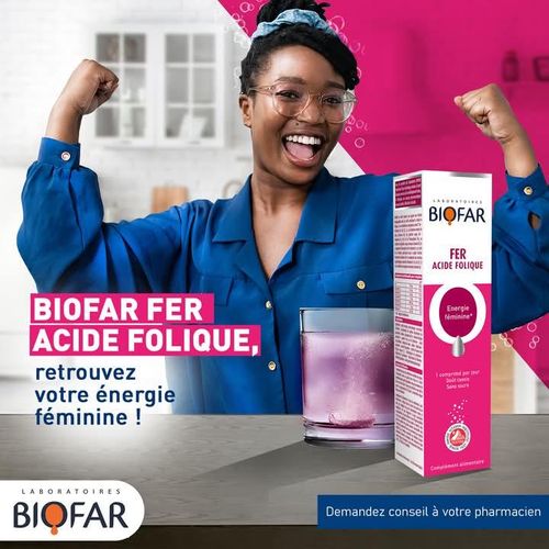 Une déficience en fer est fréquente chez la femme et peut rapidement conduire à une fatigue et un manque d’énergie. Chez la femme enceinte particulièrement, il est vivement recommandé de se supplémenter en acide folique pour la bonne croissance du bébé. N’attendez plus ! Les Laboratoires Biofar ont développé pour vous « Fer Acide folique », une formule riche et complète au bon goût de cassis, pour préserver votre énergie féminine au quotidien ou en période de grossesse.